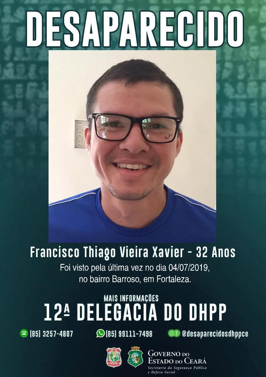 A polícia investiga o desaparecimento de um homem no Bairro Barroso, em Fortaleza, após ele ter saído para o trabalho e não ter comparecido ao local, na manhã desta quinta-feira (4). Segundo a família, Francisco Thiago Vieira Xavier, 32 anos, saiu por volta de 8h05 da casa da mãe com destino à empresa onde trabalha, que fica nas proximidades da residência, mas não apareceu no local.