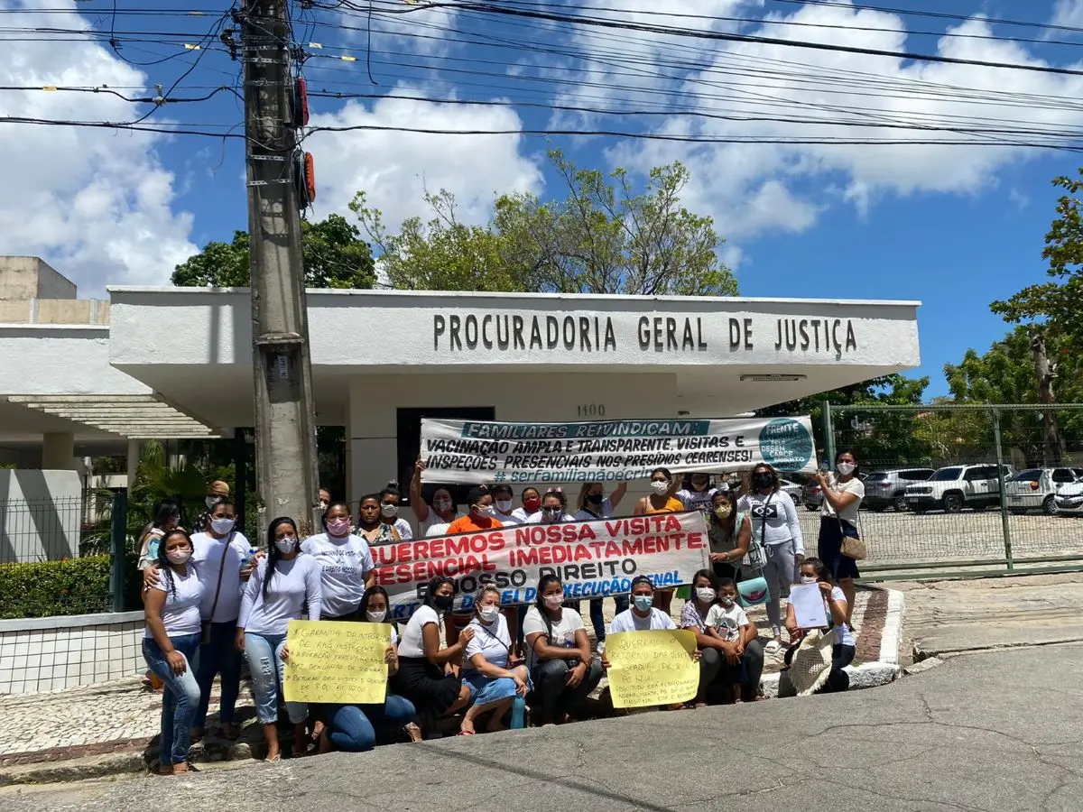 Familiares de internos do sistema prisional cearense realizaram protesto nesta segunda-feira (11) em frente à Procuradoria Geral de Justiça (PGJ) do Ministério Público do Ceará (MPCE) para pedir transparência na vacinação de presos e manutenção de visitas presenciais. Na ocasião, foi protocolado um ofício ao titular da PGJ solicitando uma reunião.