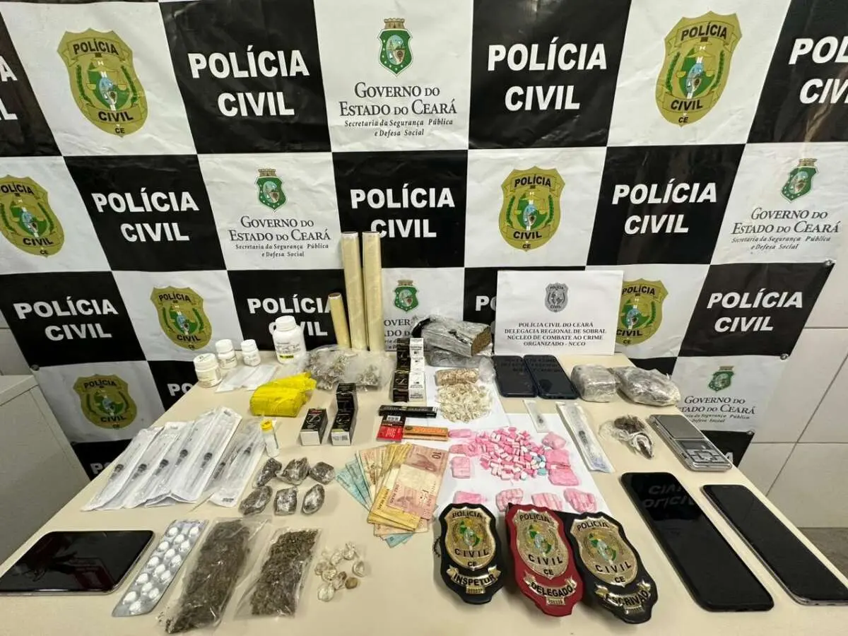 Com os criminosos, que atuavam na região Norte do Ceará, os investigadores apreenderam drogas, balanças de precisão, anabolizantes, dinheiro e celulares.