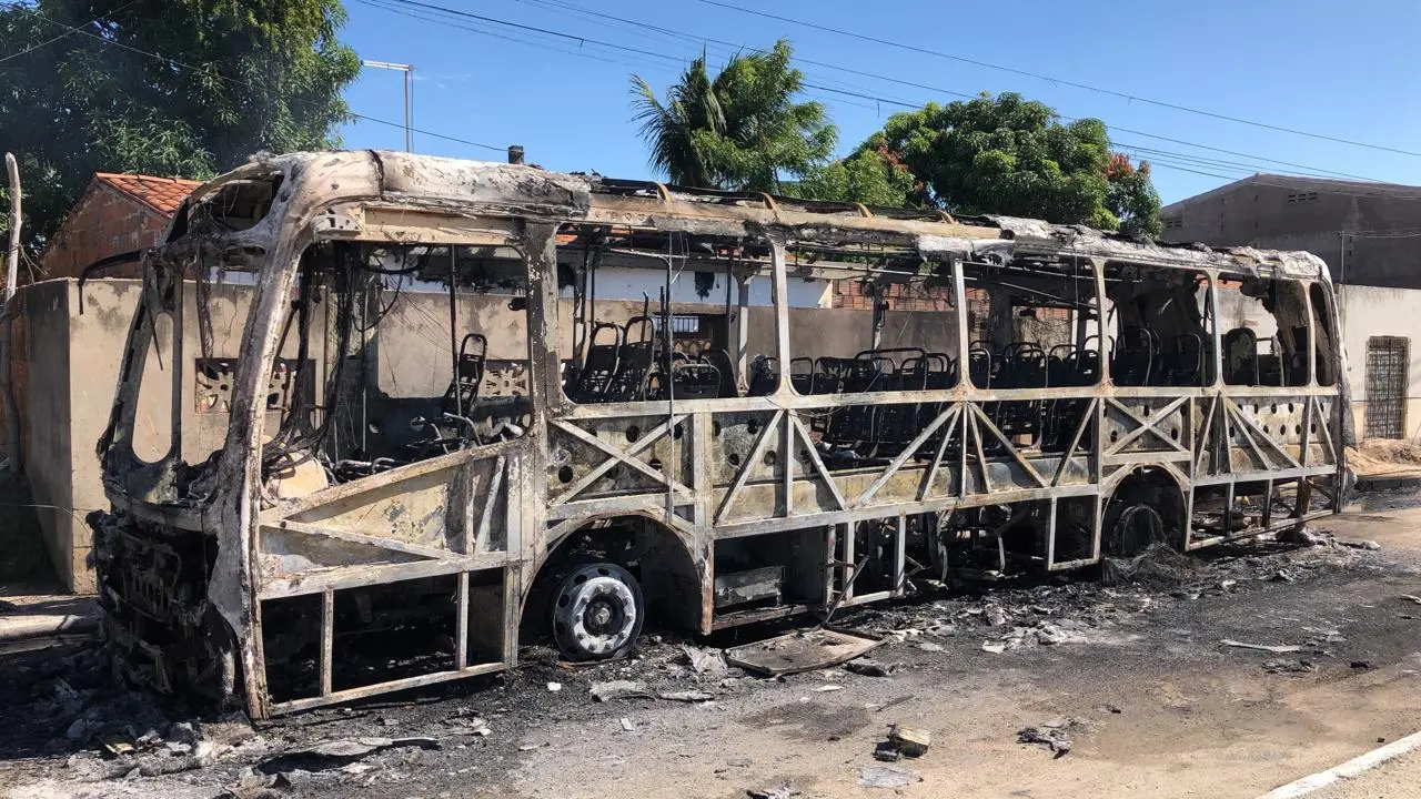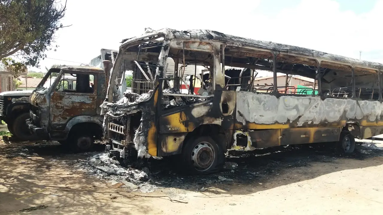 Nove ônibus de transporte escolar e uma caçamba foram incendiados em Morada Nova, Região Jaguaribana, na madrugada de sexta-feira (04). A ocorrência foi registrada por volta de 1h e ninguém ficou ferido.