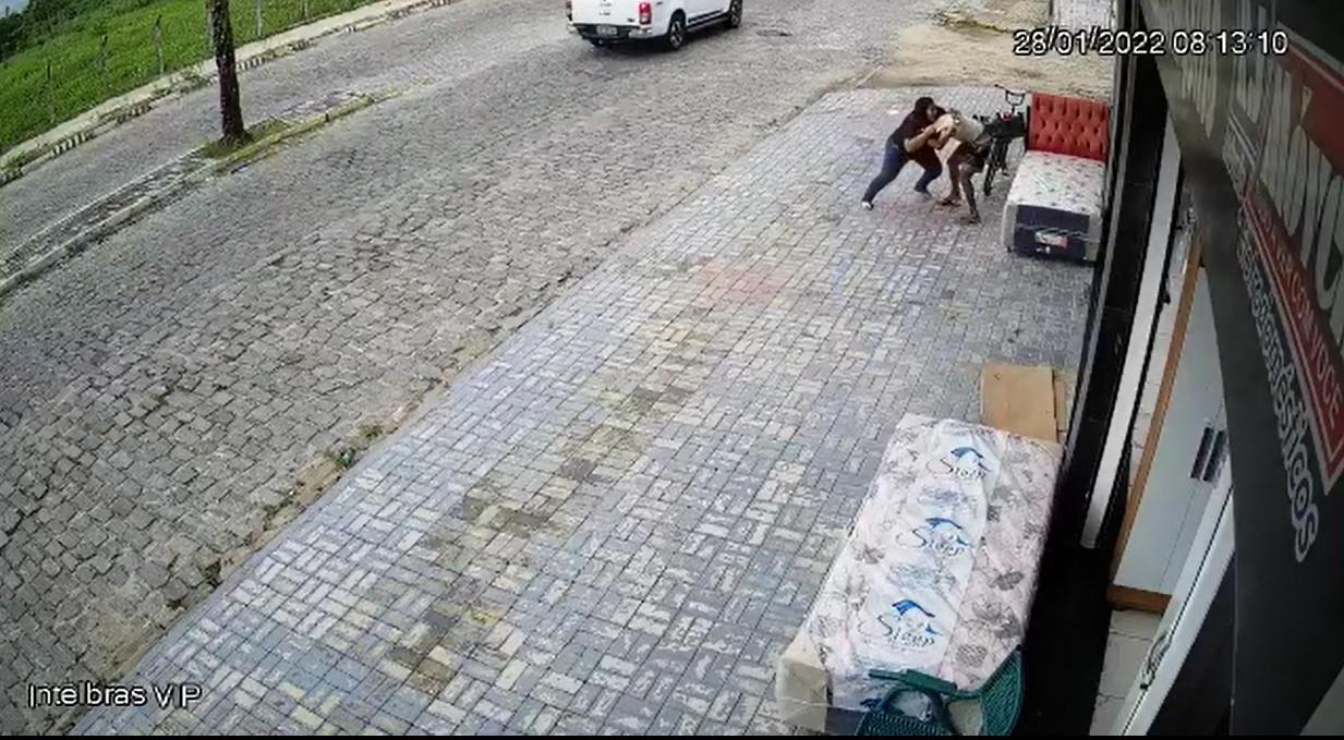 Imagens de câmera de segurança do estabelecimento flagraram o momento em que a vendedora entrou em luta corporal com o homem, até ele ser rendido