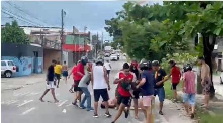 Um grupo de torcedores agrediu com chutes e pauladas um homem, sem identificação divulgada, durante uma briga na Avenida Coronel Carvalho, no Bairro Jardim Guanabara, na tarde deste sábado (26). Três suspeitos de participação no crime foram identificados pela Polícia Militar (PM).
