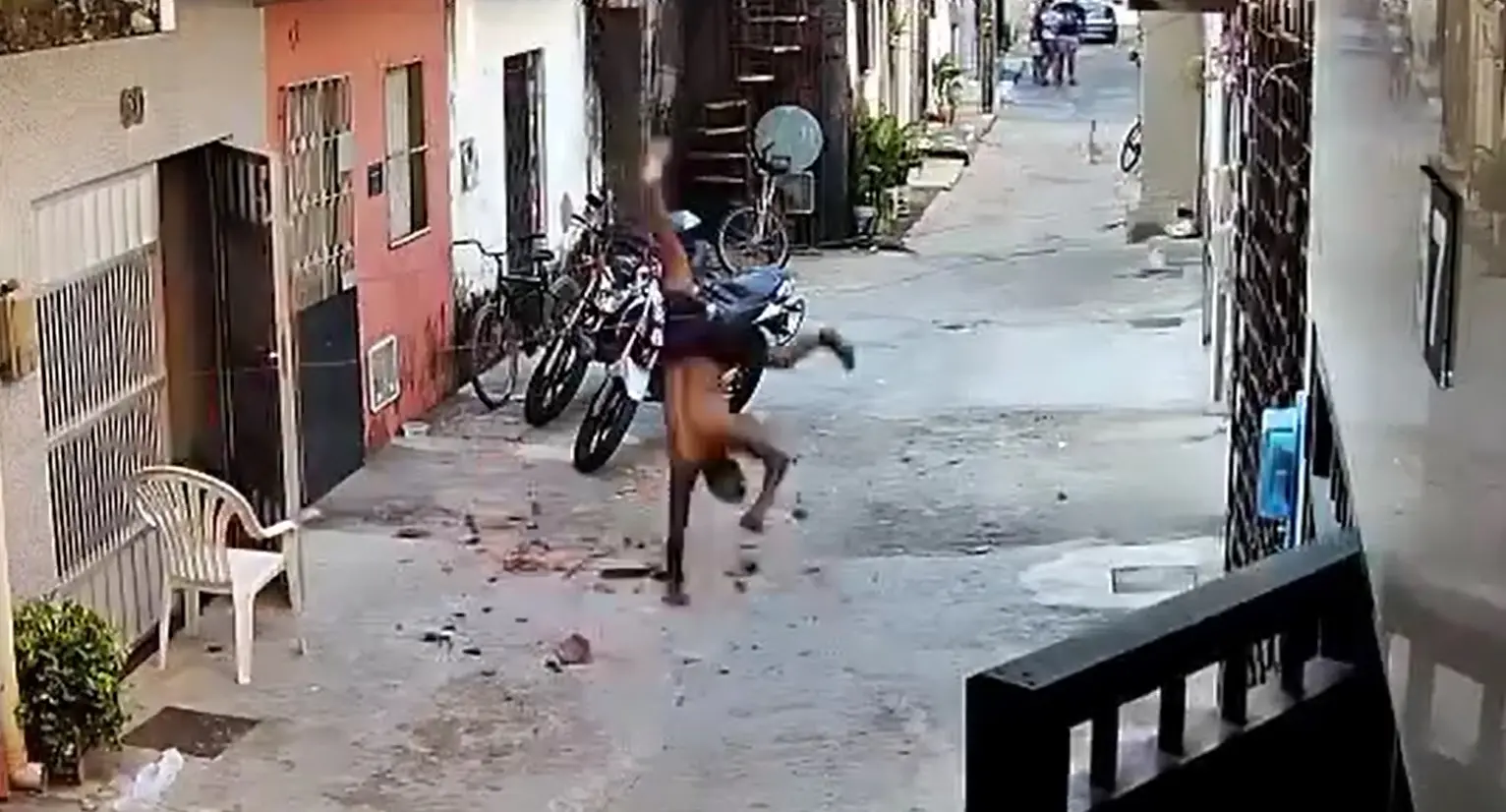 Ao perceber a aproximação dos policiais, o suspeito tentou fugir pulando muros e subindo nos telhados da vizinhança, mas, durante uma tentativa de pular de uma casa para outra, acabou caindo. A cena foi flagrada por uma câmera de segurança.