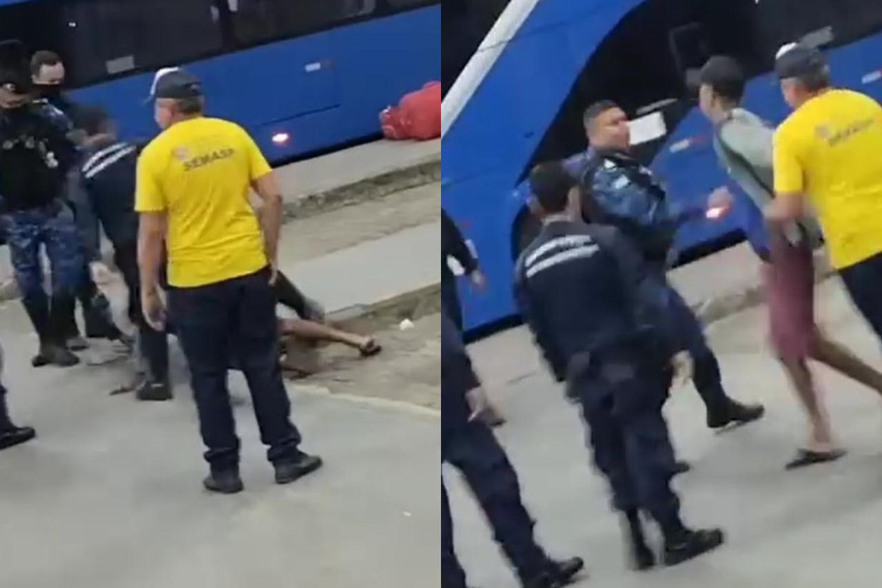 Um homem foi agredido com tapas e chutes por guardas civis em uma rodoviária de Juazeiro do Norte, no Cariri, na madrugada desta terça-feira (23). Imagens gravadas por testemunhas mostram que um dos agentes chega pelas costas e dá um tapa no rosto da vítima.