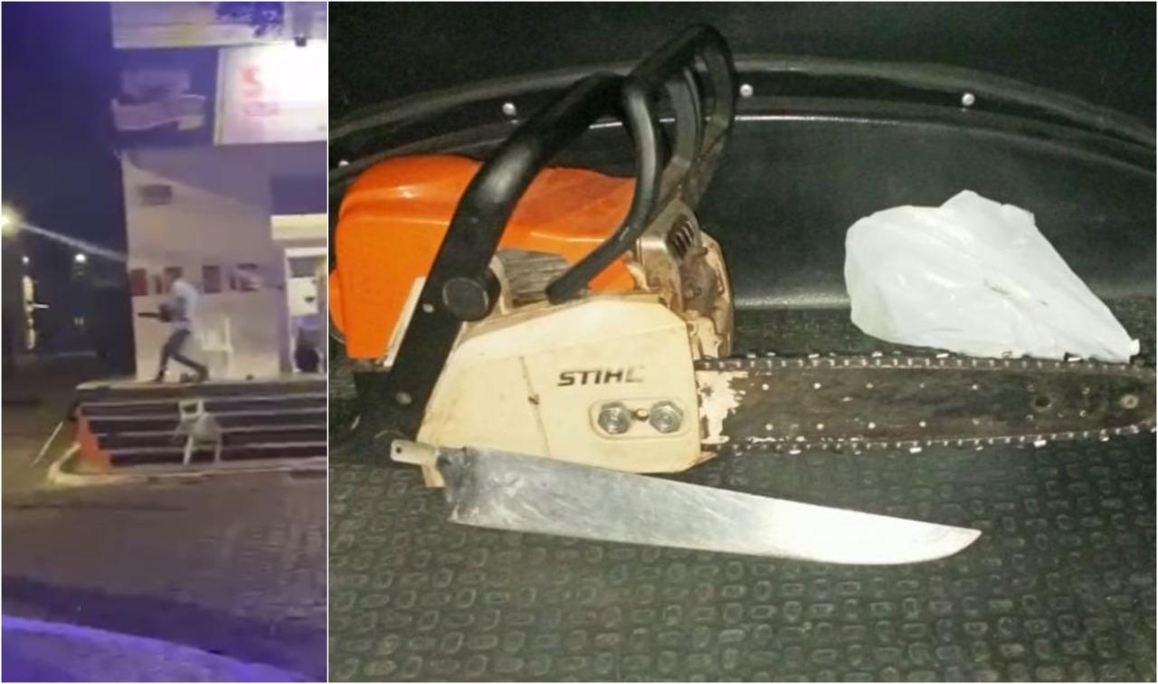 Na sequência, ele sai de lá com a motosserra na mão e procura o outro homem com quem teve a desavença. A pessoa que sofreu o ataque fugiu do local.