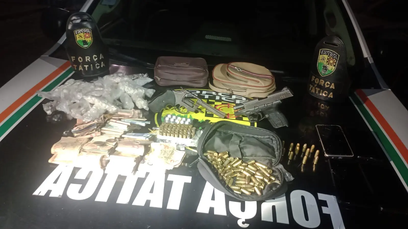 Foram apreendidos um revólver de calibre 38, uma pistola de calibre 380 e 160 munições de diferentes calibres. A dupla também portava 65g de maconha, 165g de cocaína, 155g de crack e 80 comprimidos de remédios ansiolíticos tarja preta.