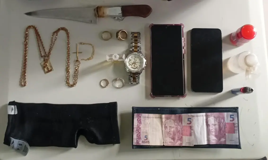 Os militares apreenderam a faca utilizada no crime, além de aparelhos celulares, bijuterias e dinheiro em espécie. Uma das vítimas reconheceu o seu celular entre os aparelhos apreendidos.