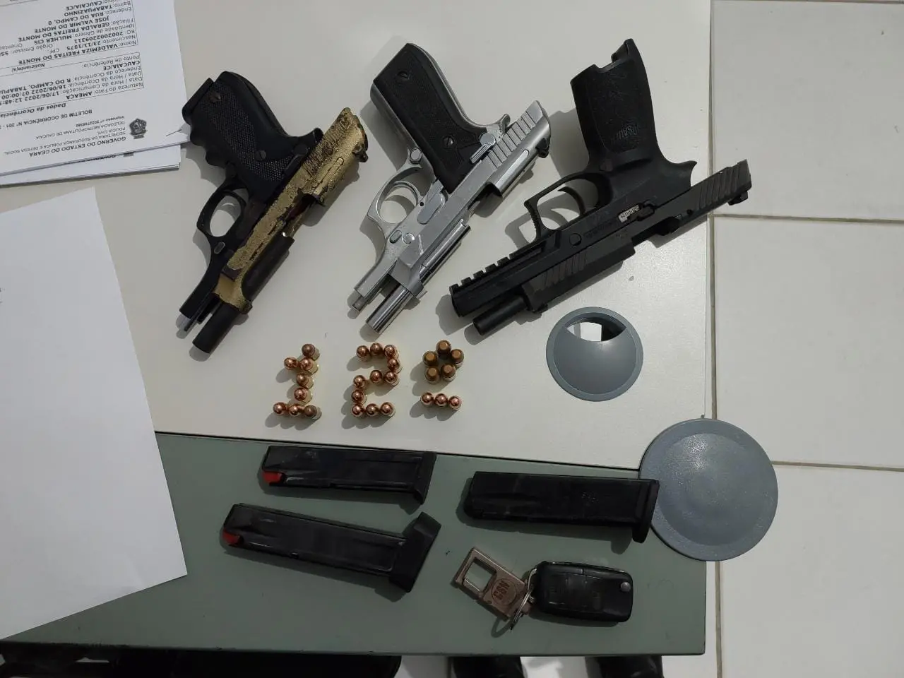 Foram apreendidas duas pistolas calibre 380 e uma pistola calibre Ponto 40 (com o brasão da PMCE), todas com carregador; mais um carregador de calibre 380; 22 munições de calibre 380; e outras 5 munições de calibre Ponto 40.