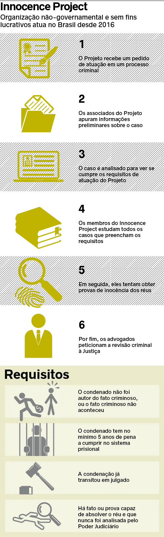 “O Innocence Project foi procurado por uma ex-namorada dele, que alegava sua inocência. Nós somos uma instituição não-governamental, sem fins lucrativos, e atuamos depois que fazemos um longo trabalho de investigação, para nos convencermos, baseados em provas, da inocência de alguém que está preso e condenado”, conta a diretora do Projeto, a advogada Flávia Rahal.