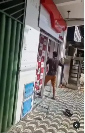 Inicialmente ele usa uma barra de ferro para tentar destruir a entrada do estabelecimento. Depois desfere chutes e murros contra a porta. Toda a ação foi filmada sem que o infrator se importasse com o flagrante. As imagens mostram que o estabelecimento é de uma marca de uma montadora de veículos.
