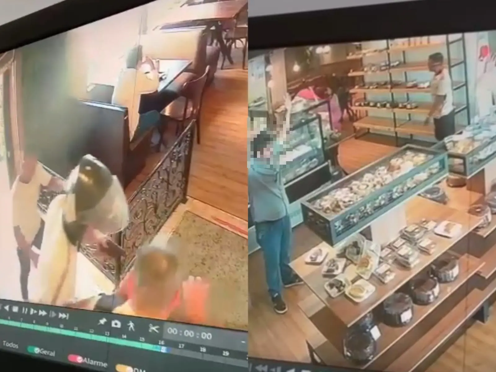 Em vídeo, é possível ver o momento em que o primeiro assaltante entra e rende o segurança particular da doceria. O segundo suspeito pega a arma do vigilante e entra com ele.