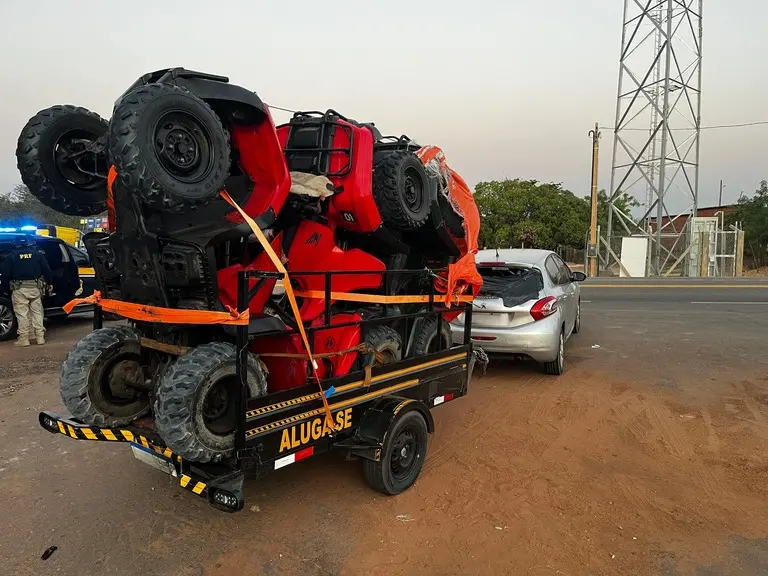 De acordo com a PRF, uma equipe realizava fiscalização na BR-135 (PI), quando abordou um veículo com reboque transportando três quadriciclos. No carro estavam três homens: o motorista, de 31 anos, e dois passageiros com 31 e 37 anos.