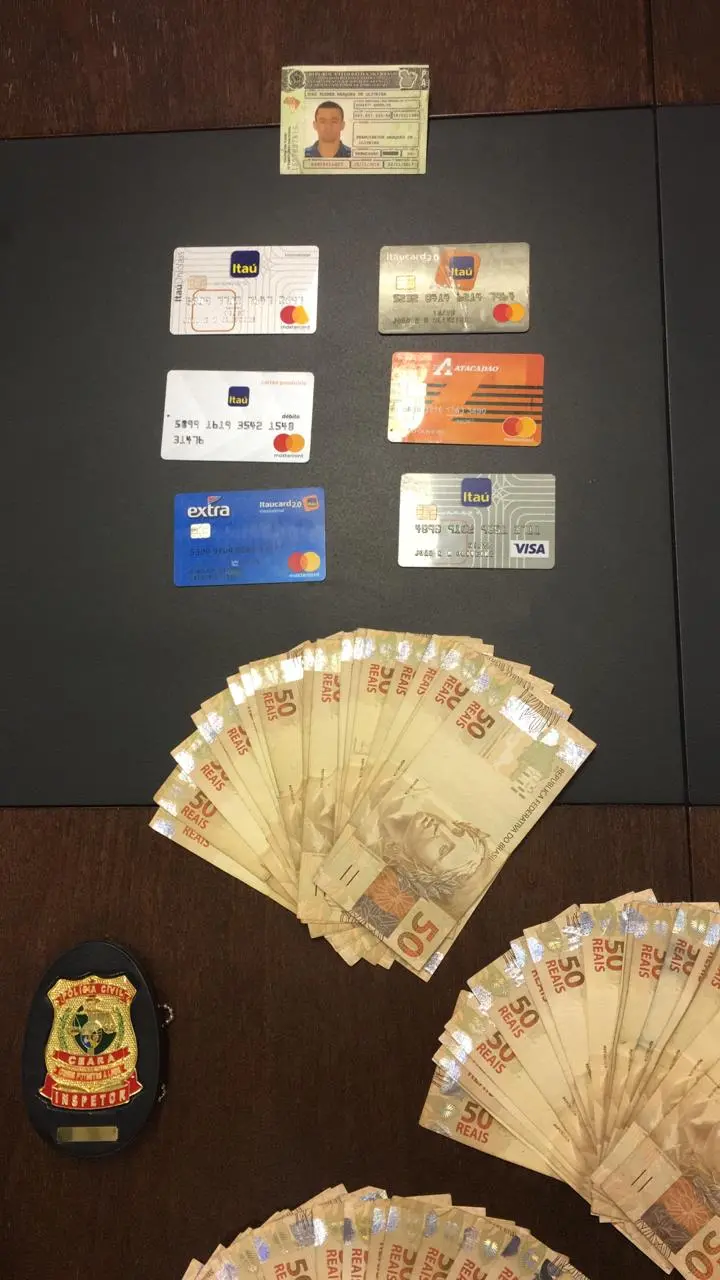 Com ele, foi apreendida uma CNH falsa, cartões de crédito falsificados e a quantia de R$3 mil. A Polícia também apura a participação de um motorista de aplicativos, já que, precavido, Cleber só se deslocava na Capital utilizando o serviço. Ele não possuía veículo próprio.