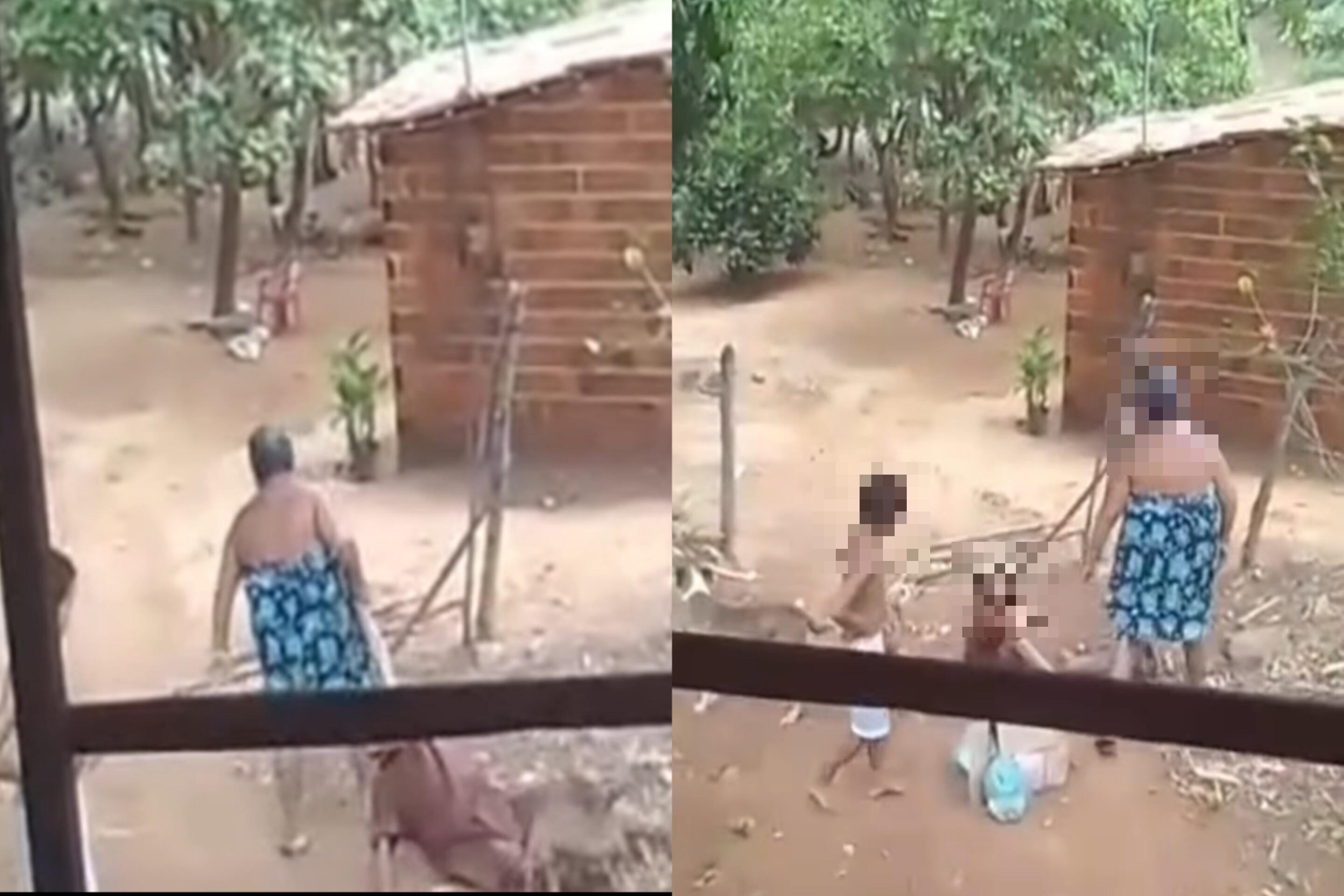 O grau de violência aumenta após uma série de socos. Ela puxa a idosa pelo braço e arrasta ela no chão de terra.