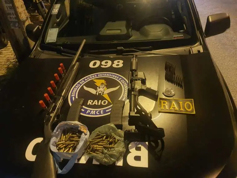 Um homem foi preso e um fuzil americano 223 (equivalente ao calibre 5.56) apreendido, em uma ação do Comando de Policiamento de Rondas de Ações Intensivas e Ostensivas (CPRaio), da Polícia Militar do Ceará (PMCE), no último sábado (26). Carlos Augusto Alves Barros, de 28 anos, seria integrante da facção cearense e estaria fugindo do ataque de populares, com pedradas e tiros, quando foi detido pelos policiais. Ele foi baleado na orelha.