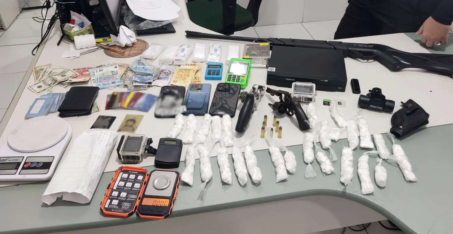 Durante o cumprimento da ordem judicial de captura e também de busca e apreensão, realizado na última quinta-feira (3), em uma ação policial batizada de ‘Operação Medellin’, os policiais encontraram três armas de fogo, munições, 570 gramas de cocaína, cartões, dinheiro nacional e internacional, e outros materiais.