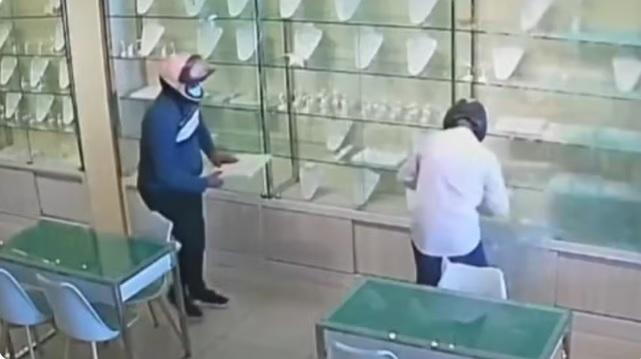 Nas imagens, é possível ver o momento em que os homens chegam à loja usando capacetes para dificultar suas identificações. Eles quebram parte da vitrine e levam joias.