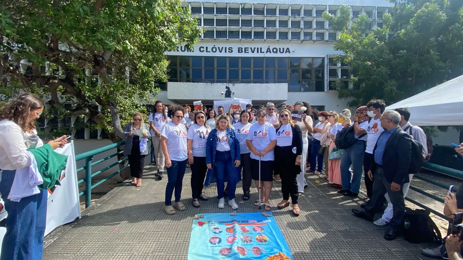 Familiares das vítimas realizaram um ato com faixas e cartazes na entrada no Fórum Clóvis Beviláqua, no bairro Édson Queiroz, e gritaram o nome dos jovens assassinados.