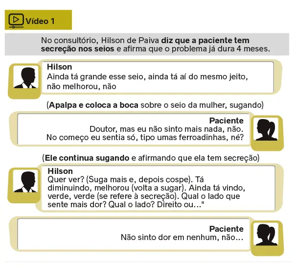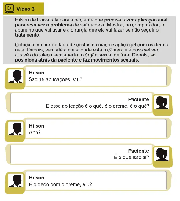 Durante o tratamento, José Hilson coloca os dedos com gel na vagina das pacientes e faz movimentos sensuais. O procedimento se repete em mais de 40 vídeos. Em muitos deles, ele acaricia e aperta os seios como parte do exame. “Tem que sentir a sensibilidade. Qual tu sente mais, o direito ou o esquerdo?” pergunta.