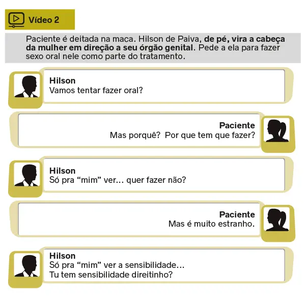 Além da “aplicação” vaginal, em muitas consultas, ele pedia à paciente para fazer sexo oral nele, método que o profissional chama, nos vídeos, de “aplicação oral”. Uma das mulheres conta que procurou José Hilson, há sete anos, em Uruburetama, porque estava tentando engravidar. Nunca tinha ido ao ginecologista antes.