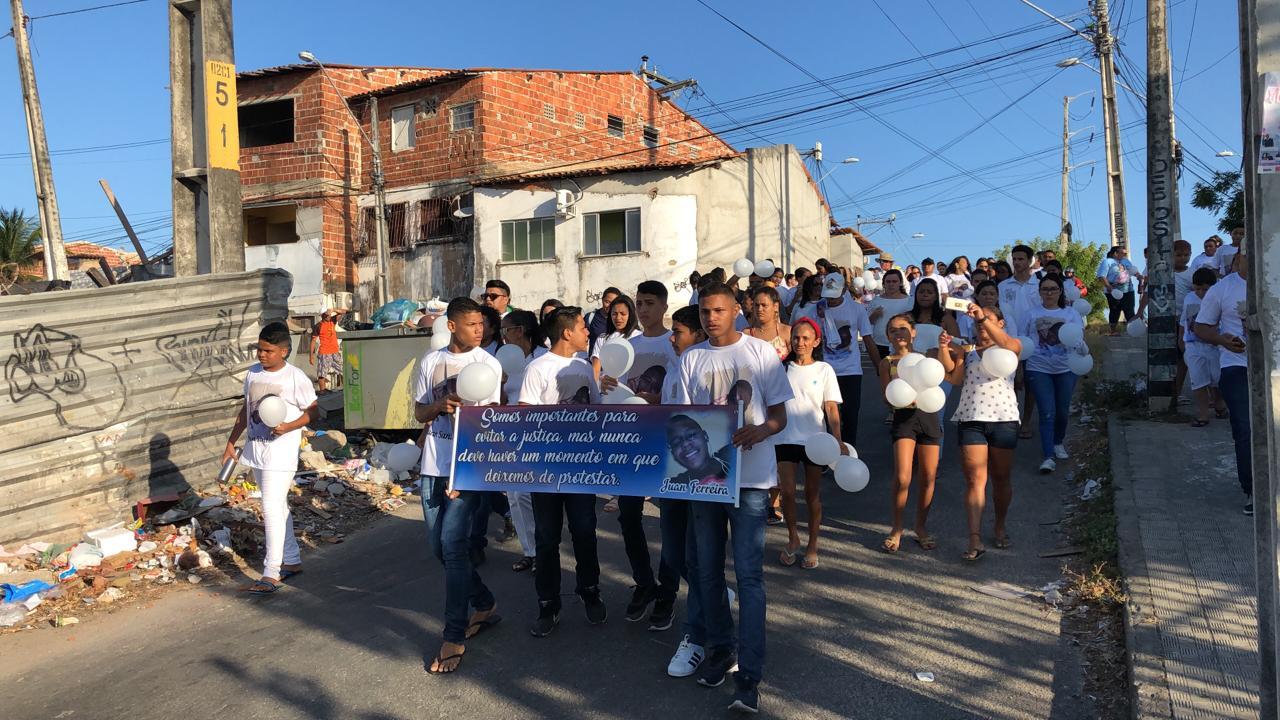 Amigos e familiares do adolescente de 14 anos, Juan Ferreira dos Santos, se reuniram em uma caminhada e missa de 7º dia, no bairro Vicente Pinzón, na tarde desta quinta-feira (19). Juan morreu no dia 13 deste mês, próximo a sua residência, após ser atingido por um tiro vindo de um soldado da Polícia Militar que patrulhava no bairro.