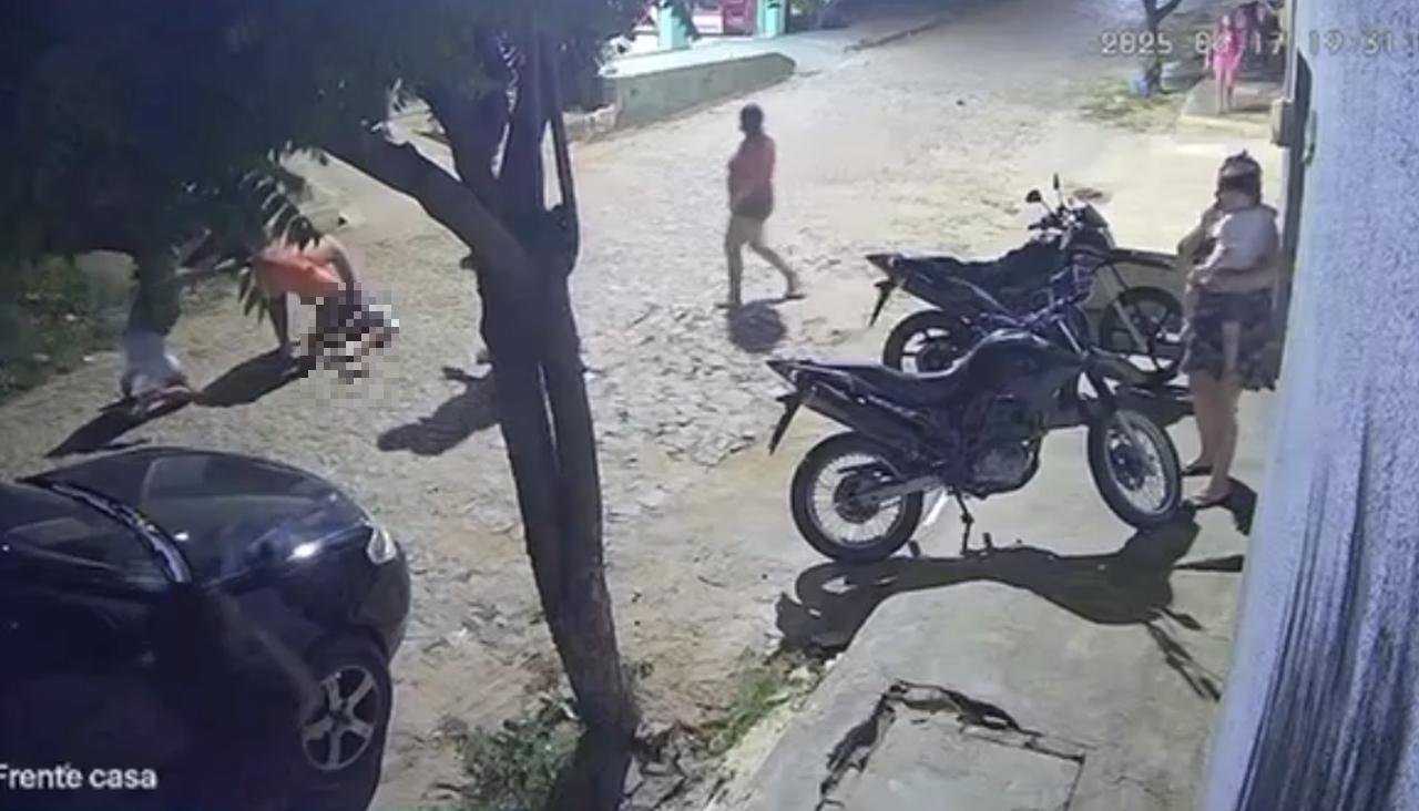 O caso ocorreu na rua Tarciane Viana, no bairro Edmilson Correia. O momento foi flagrado por uma câmera de segurança. As imagens mostram o desespero da mãe da menina.