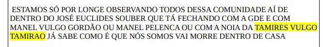 O papel de liderança de Tamiris dentro da GDE é ainda mais evidente, conforme o MPCE, se analisado um "salve" publicado por uma facção rival nas redes sociais. Nele, o nome da acusada é citado como um exemplo de pessoa cujos moradores do José Euclides não poderiam se envolver, sob pena de morte.