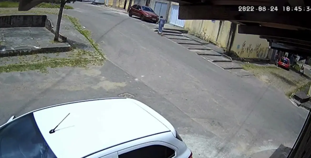 Inicialmente, o homem chega à rua em um carro vermelho, que aproxima de uma calçada. A vítima, então, surge na imagem caminhando com uma sacola na mão e passa pelo veículo de costas.