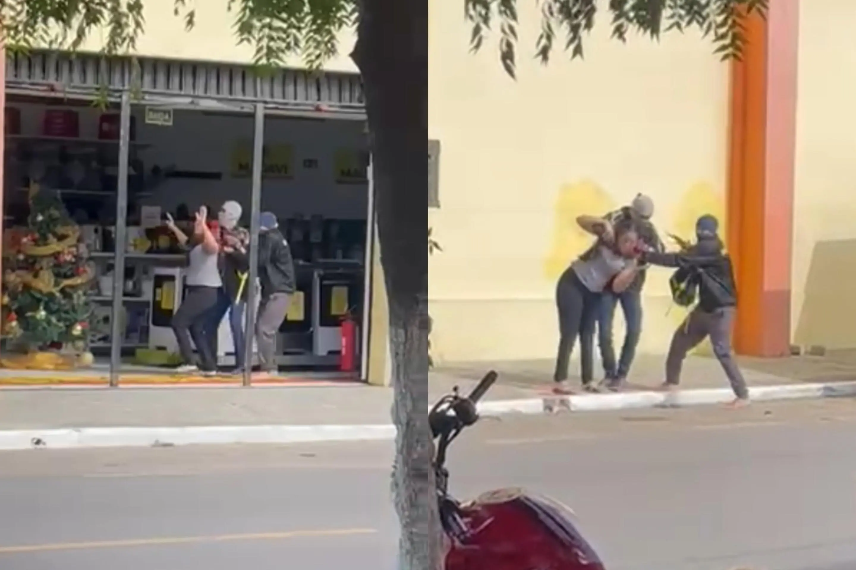 Imagens divulgadas nas redes sociais mostram dois assaltantes levando a vítima à força para um veículo na frente da loja.