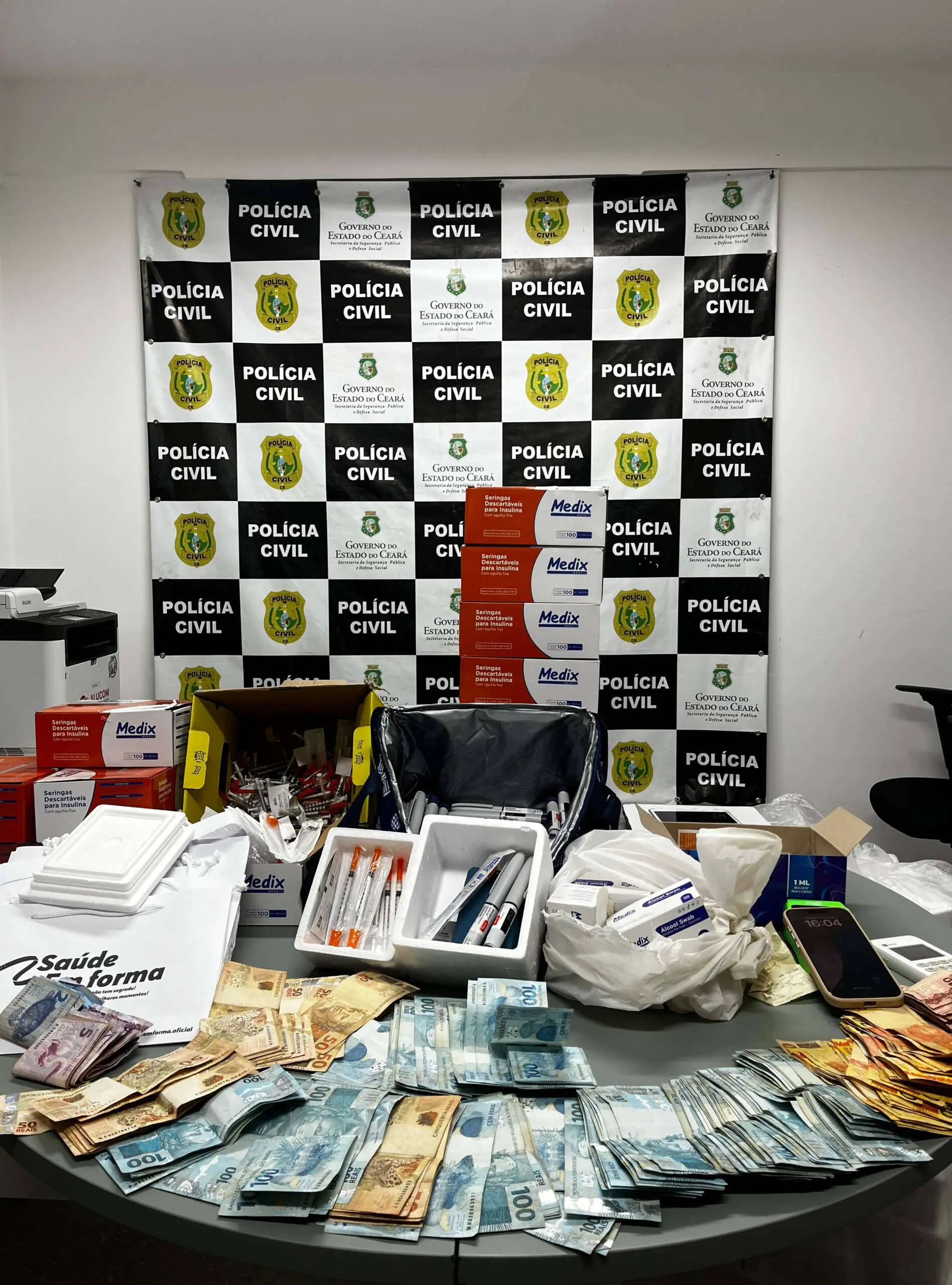 No momento da captura, foram apreendidas dezenas de canetas e aproximadamente R$ 19 mil em espécie. Segundo a Secretaria da Segurança Pública e Defesa Social do Ceará (SSPDS), os policiais da Delegacia de Cascavel foram até o endereço após receberem denúncias anônimas.