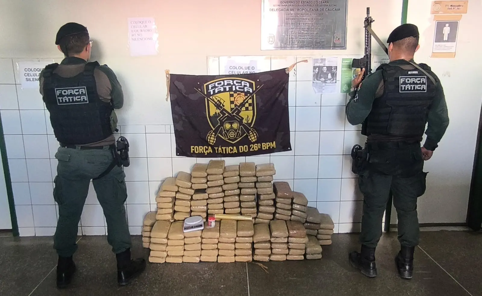 "Os policiais militares conduziram a mulher para a 1ª Delegacia de Polícia Civil de Caucaia, onde ela foi autuada em flagrante pelo crime de tráfico de drogas. Após os procedimentos cabíveis a suspeita foi colocada à disposição da Justiça", segundo a Secretaria.