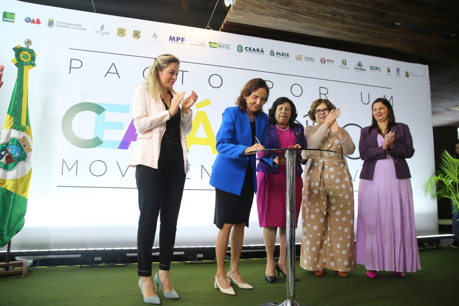 A governadora Izolda Cela e outras autoridades assinaram o decreto que criou o Sistema de Integração e Gestão de Informações de Mulheres em Situação de Violência Doméstica e Familiar (SIGIM), em reunião do Pacto por um Ceará Pacífico.