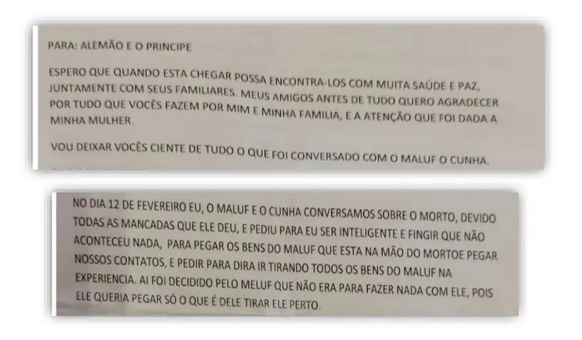 'Maluf' e 'Collor' teriam brigado dentro do Presídio Federal. O bilhete afirma que o primeiro homem teria ordenado que o segundo vendesse "umas casas, terrenos e academia" e devolvesse o dinheiro para a família daquele.