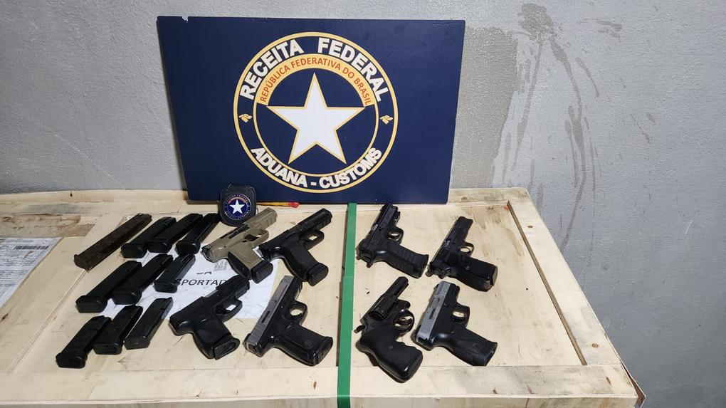 Segundo a Receita Federal, foram apreendidos um revólver calibre 38, uma pistola calibre 9mm, uma pistola calibre .40 e outras 5 pistolas de calibre não identificado, além dos 17 carregadores - de calibres variados.