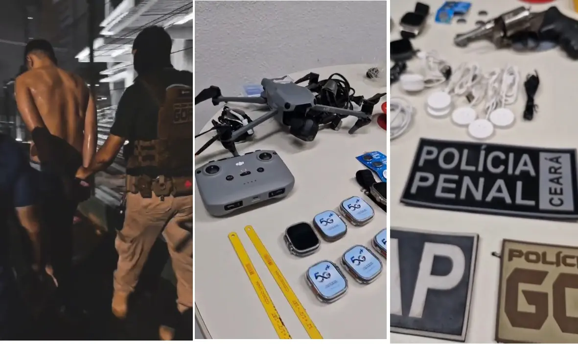 Na ocasião, uma ofensiva da Polícia Militar do Ceará (PMCE) resultou na captura de um trio que se preparava para entregar 19 aparelhos celulares, 40 carregadores e cinco relógios inteligentes (smartwatches), com o apoio de dois drones, em uma unidade prisional.