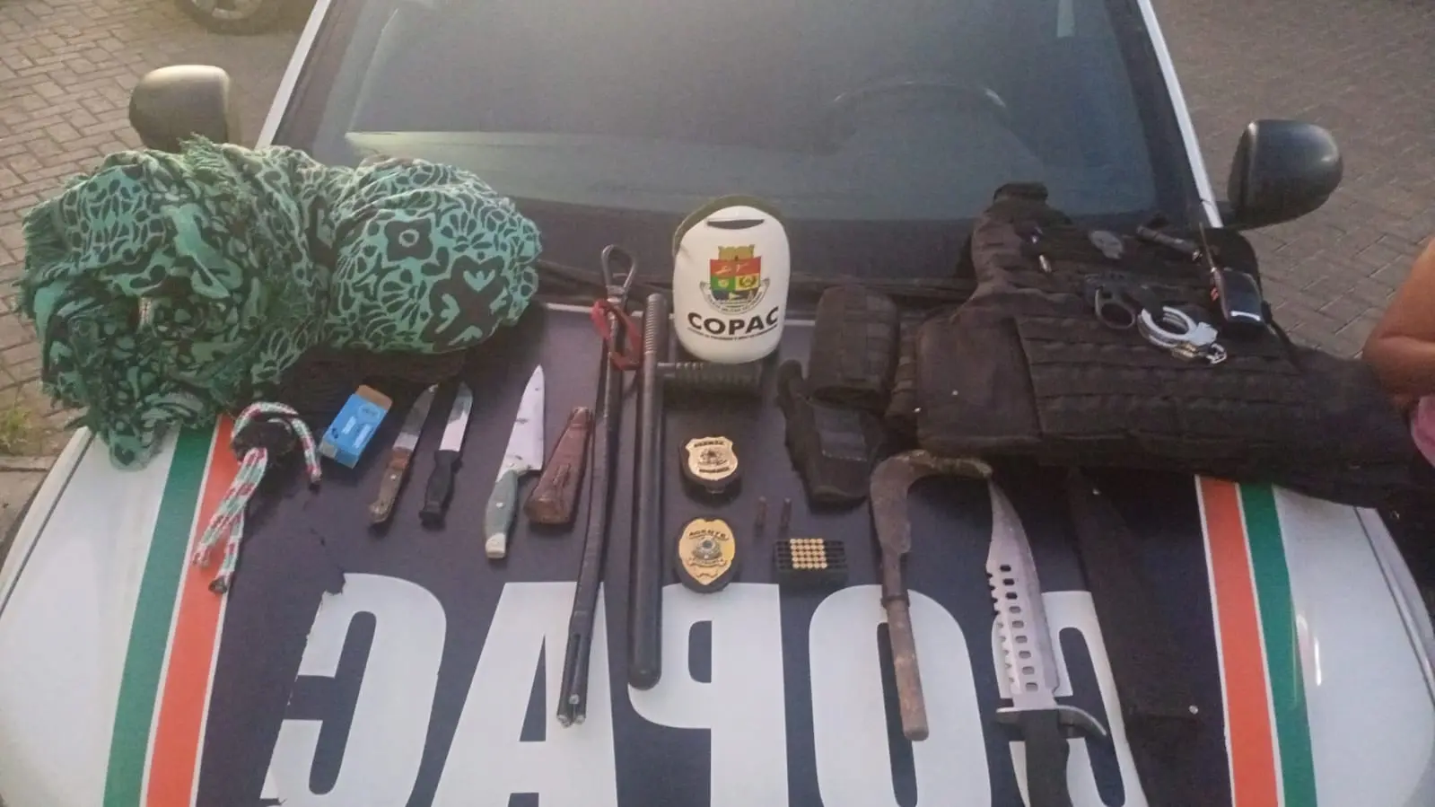 Segundo a Secretaria de Segurança Pública e Defesa Social (SSPDS), a PMCE apreendeu, no local da prisão, 24 munições calibres 22 e 38, três facas, um facão, uma machadinha, uma capa de colete balístico, um par de algemas, uma tonfa preta, um chicote e três preservativos.