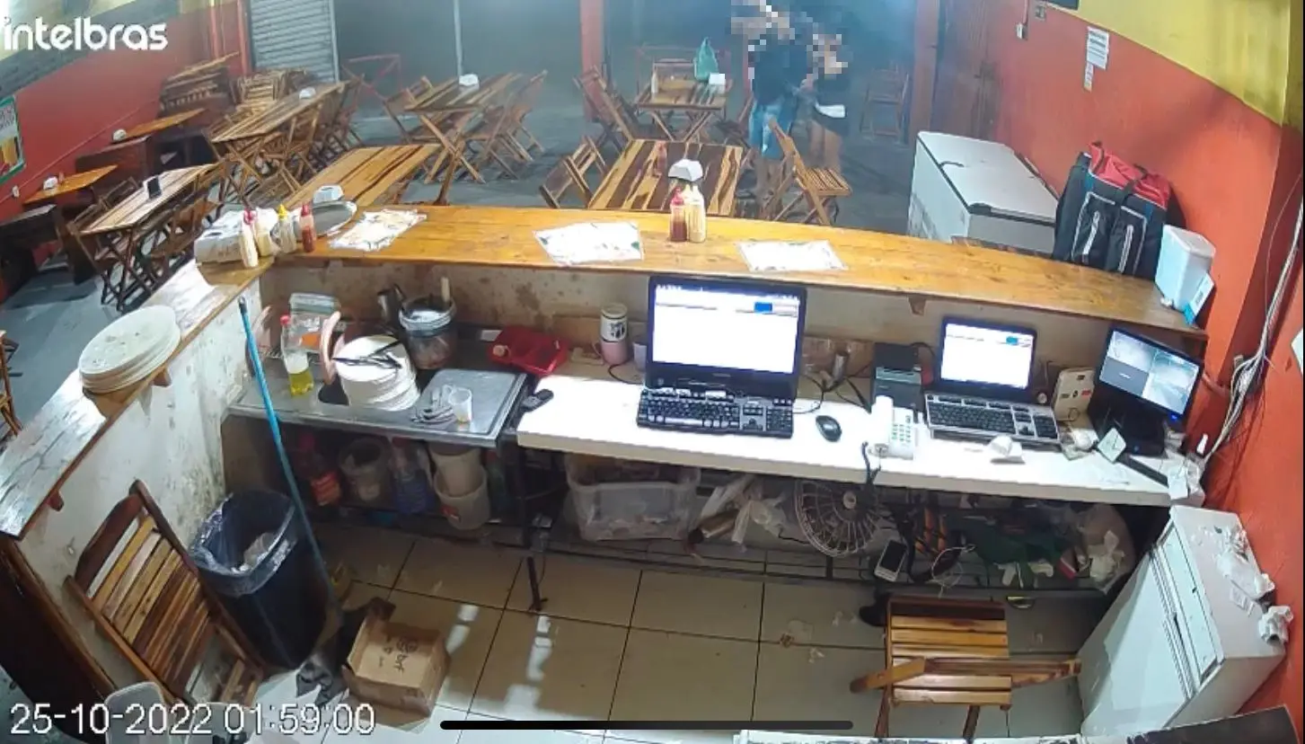 Com várias câmeras de segurança, a pizzaria conseguiu registrar algumas das ações nas últimas semanas. Em uma delas dois homens usando capacetes de moto entram no estabelecimento e rendem os clientes e os funcionários.