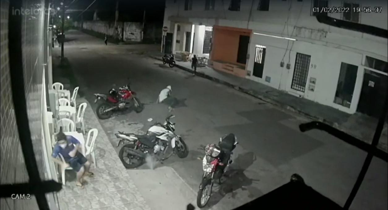 Nas imagens, é possível ver que alguns clientes estão sentados em cadeiras na rua Tibúrcio Frota, quando um homem se aproxima com uma arma e anuncia o assalto. O policial militar reagiu, houve troca de tiros e o suspeito foi atingido.