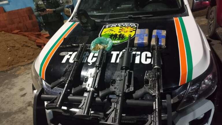 A Polícia Militar apreendeu quatro fuzis e dois quilos de drogas na cidade de Parambu, Interior do Ceará, nesse sábado (22). Durante as buscas, dois homens morreram em confronto com os policiais.
