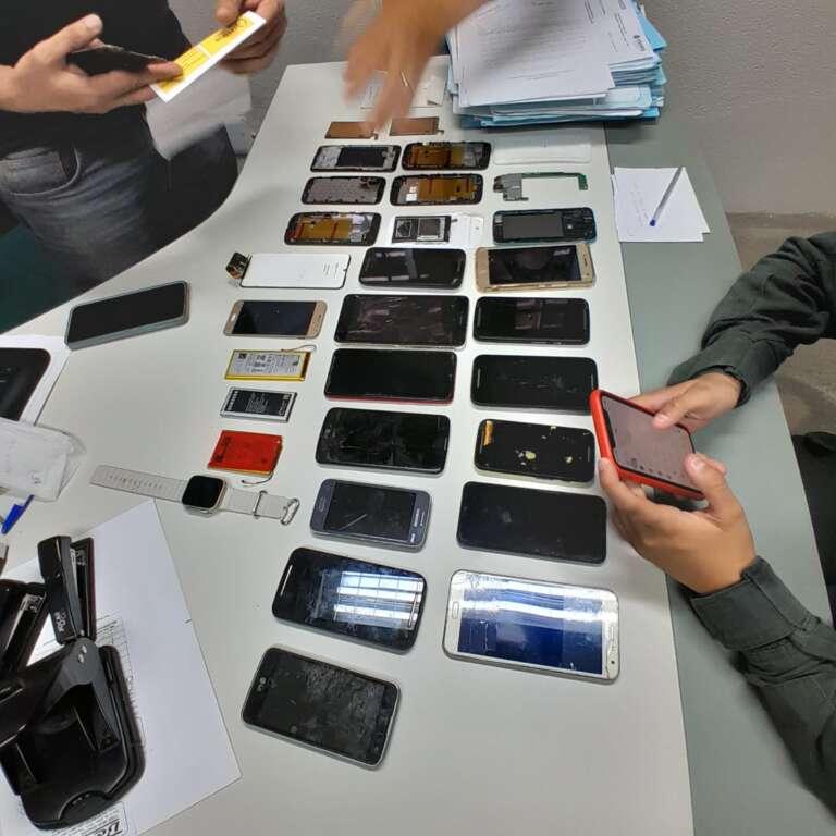 Os policiais foram ao local e localizaram o suspeito. Durante a busca, dois aparelhos foram encontrados dentro de um vaso sanitário. Uma nova informação indicou que o homem tinha deixado um saco com vários outros celulares na Avenida Bernardo Manoel.