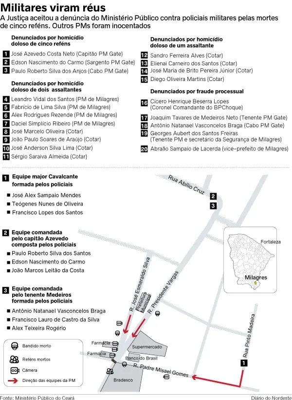 15 policiais militares são réus pelos homicídios ocorridos em Milagres, na madrugada do dia 7 de dezembro de 2018. Outros 4 militares são réus por fraude processual, junto do então vice-prefeito de Milagres.