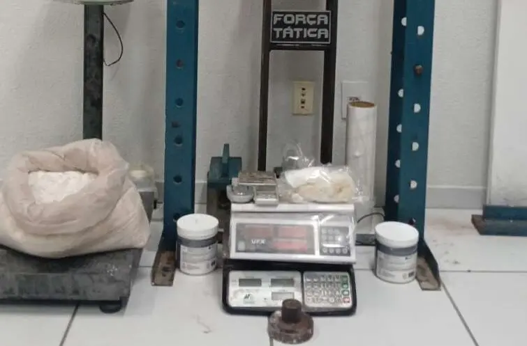 No local, os policiais apreenderam cerca de 55 gramas de crack, 156 gramas de cocaína e cerca de dez quilos de uma substância em pó branco, além de balanças de precisão e outros objetos utilizados para a atividade ilícita.