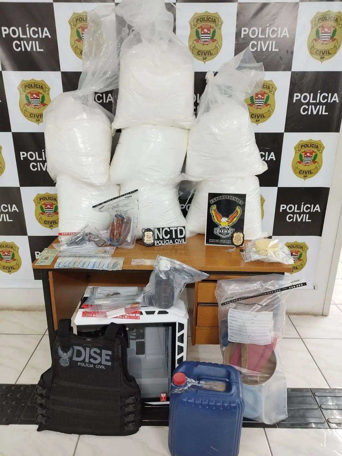Na residência onde ele foi encontrado, foram apreendidos um revólver calibre 38 municiado, crack, cocaína, aparelhos celulares, uma balança de precisão, cadernos com anotações relacionadas ao tráfico de drogas, um carro, uma moto, além de mais de 140 quilos de insumos para fabricação e desdobramento de entorpecentes.