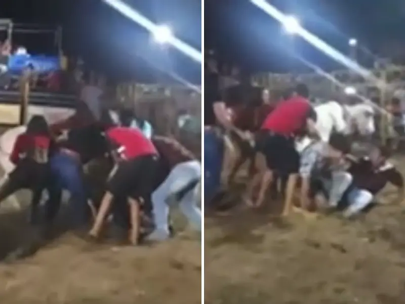 Um dos bois que aparece nas imagens é cercado e várias pessoas ao mesmo tempo se jogam em cima dele, na tentativa de derrubá-lo. Ele tem a cabeça, o rabo e as pernas agarrados e puxados e acaba caindo e sendo imobilizado.