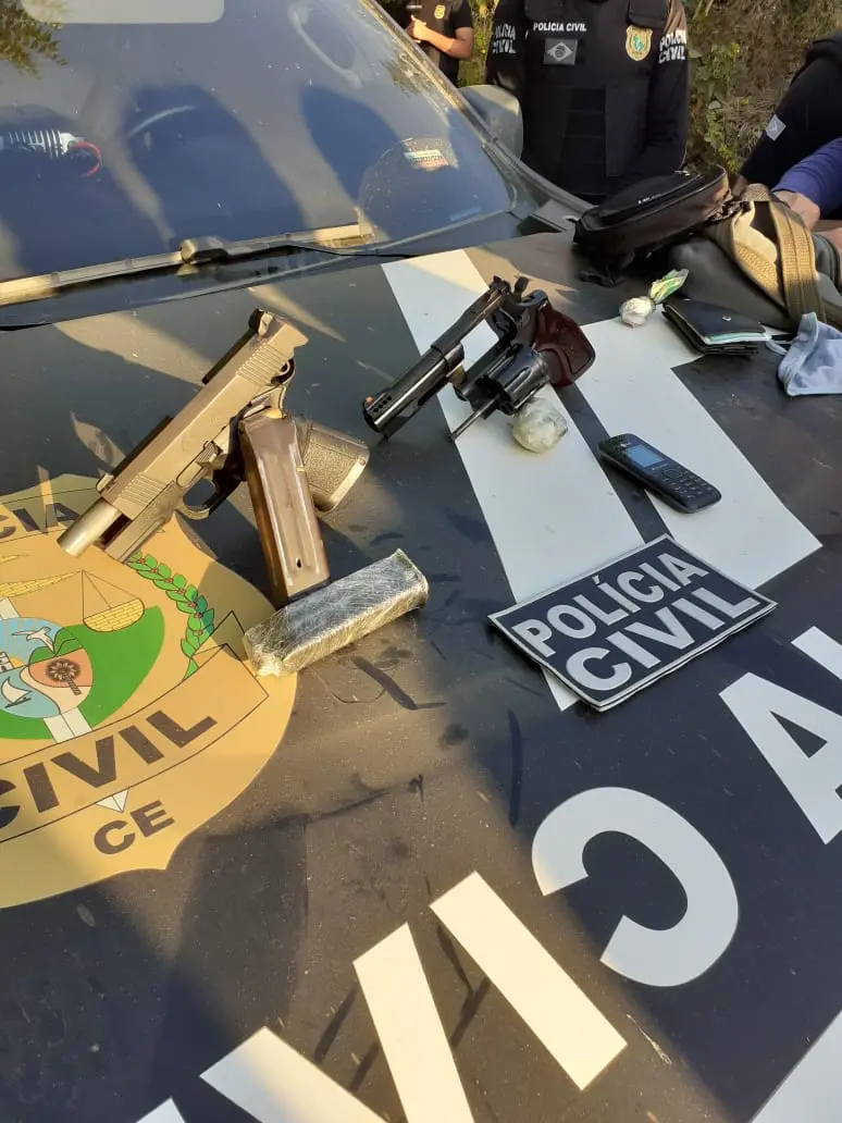 Durante a prisão, os policiais civis apreenderam uma pistola, um revólver municiados e um documento falso.
