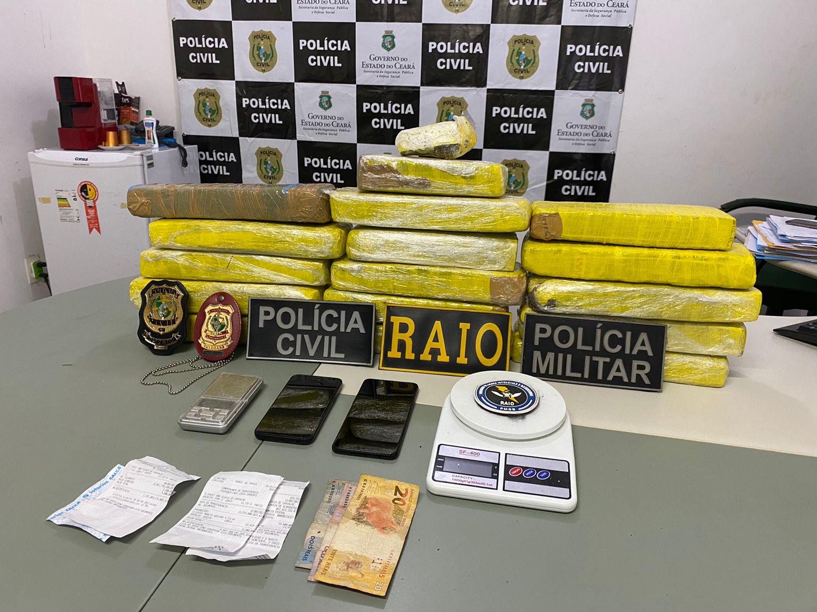 De acordo com o delegado lotado em Jaguaruana, Gutemberg Sousa, a droga estava em formato de tablete. Também foram apreendidas duas balanças de precisão, aparelhos celulares, comprovantes de depósito de transação no valor de R$ 25 mil, supostamente oriundos do tráfico.