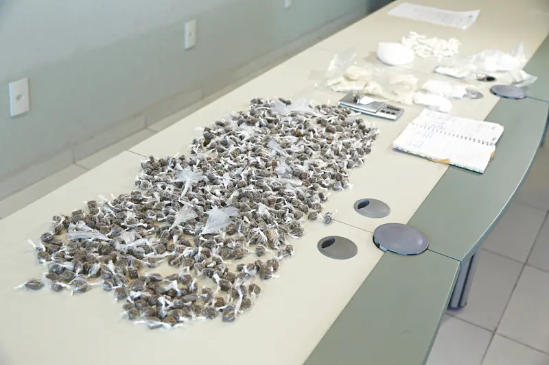 No imóvel, foram localizadas 600 'trouxas' de maconha, 75 papelotes de cocaína prontos para comercialização, 234 gramas de cocaína, 330 gramas de crack, uma balança de precisão, caderno com a contabilidade do tráfico e uma motocicleta Kawasaki/Z800.