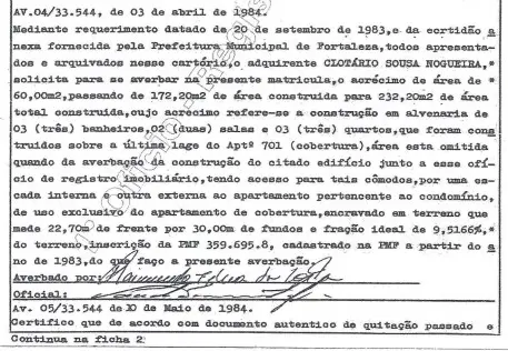 O registro foi realizado pelo bancário Clotário Sousa Nogueira, que adquiriu o apartamento em 1983, após, segundo ele, ter constatado que a área extra não estava presente no documento de compra ao qual teve acesso.