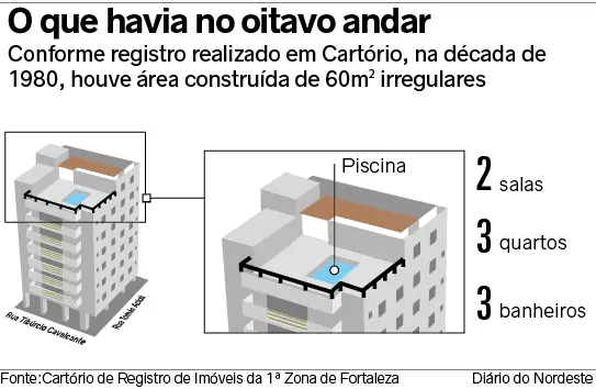 O oitavo andar é um anexo do apartamento 701 e teria sido construído entre 1982 e 1983, segundo apontam documentos obtidos pelo Sistema Verdes Mares. O acréscimo de 60m² de área construída "refere-se à construção em alvenaria de 3 (três) banheiros, 2 (duas) salas e 3 (três) quartos, que foram construídos sobre a última laje do apto 701 (cobertura), área esta omitida quando da averbação da construção do citado edifício", anota o Cartório de Registro de Imóveis da 1ª Zona da Comarca de Fortaleza.