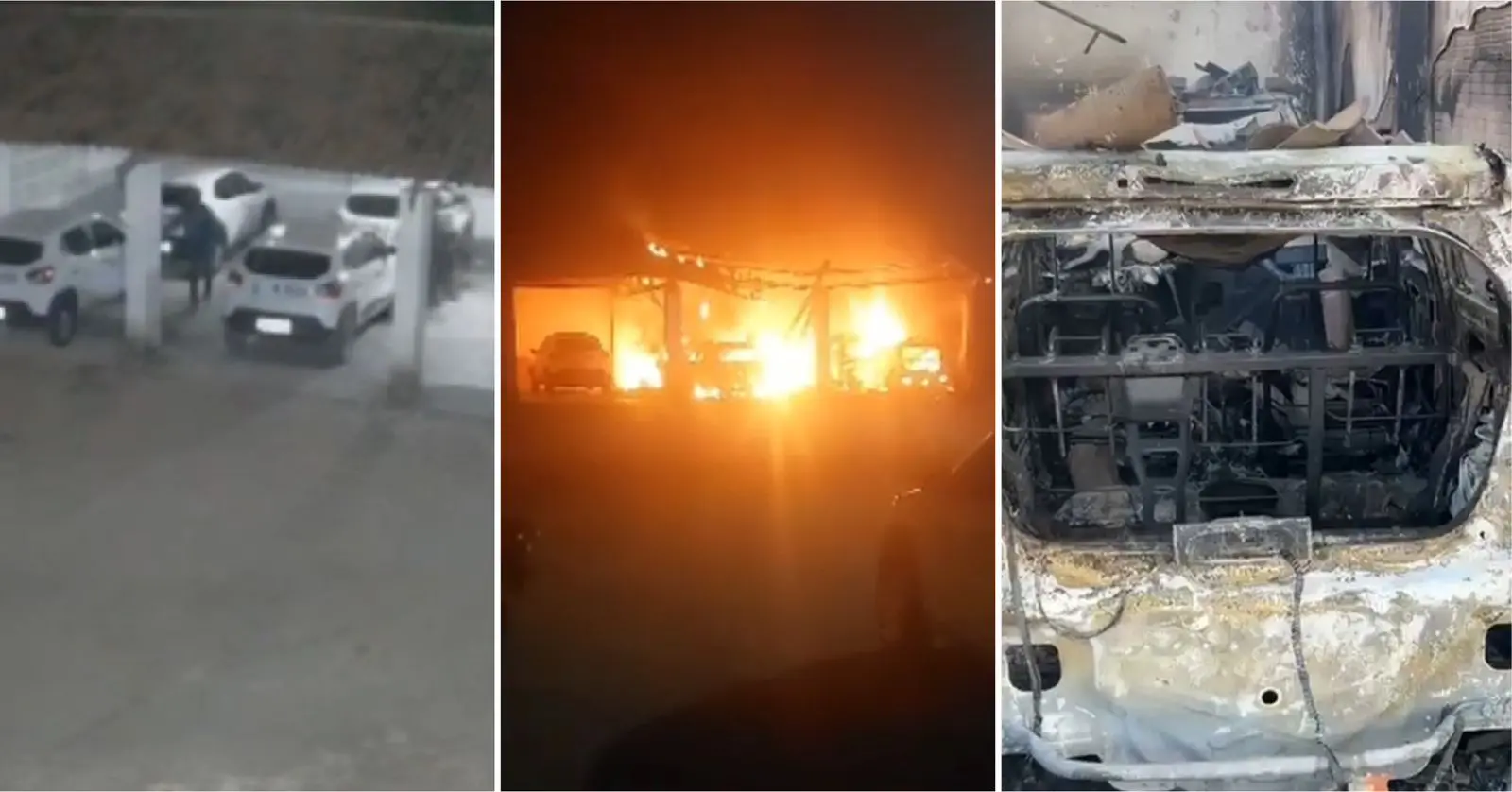 Nas imagens, é possível ver o momento em que, encapuzados, os criminosos derramam substâncias inflamáveis sobre os veículos e ateiam o fogo. Eles, depois, saem do local.